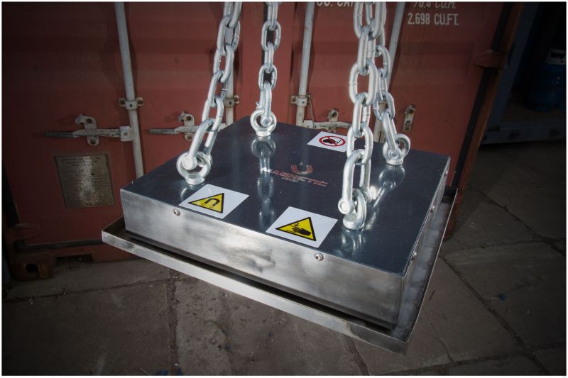 Układ magnetyczny płyty został wykonany z magnesów ferrytowych, zamknięty w obudowie ze stali kwasoodpornej. Płyta służy do wychwytywania niepożądanych elementów stalowych z przenoszonych materiałów sypkich. Płyta magnetyczna podwieszana nad taśmociągiem pozwala na regulację wysokości płyty od taśmy w zależności od transportującego materiału. Płyta wyposażona w ręczną nakładkę szybkoczyszczącą.Płyta znajdzie zastosowanie w różnych dziedzinach przemysłu :